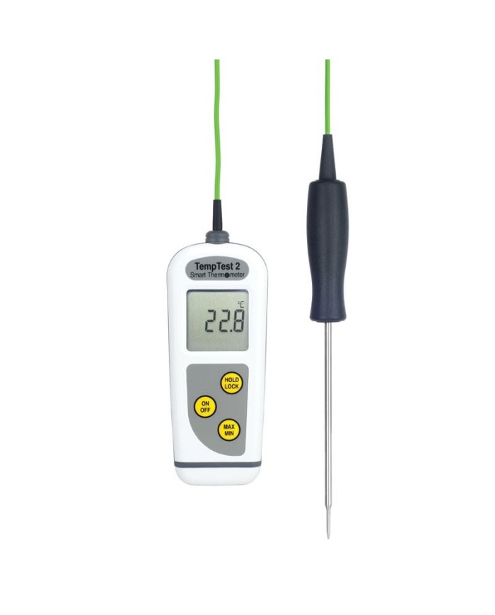 1.260 krETI Termometer TempTest® 2. Inklusive fast extra snabb givare Ø3.3 x 100mm med 0,5m kabel. Displayen auto-roterar för enkel avläsning. IP67. Mätområde -50 till 300°C. Med kalibreringscertifikat och bärväska.