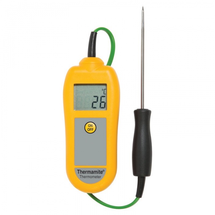 1.040 krETI Termometer Thermamite® för HACCP och egenkontroll för livsmedel. Gult hölje. Inklusive fast insticksgivare med kabel. Mäter mellan -50°C till 300°C. Kalibreringscertifikat ingår.