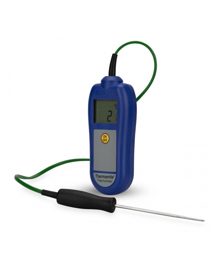 1.350 krETI Termometer Thermamite® för HACCP och egenkontroll för livsmedel. Blått hölje. Inklusive fast insticksgivare med kabel. Mäter mellan -50°C till 300°C. Kalibreringscertifikat ingår.