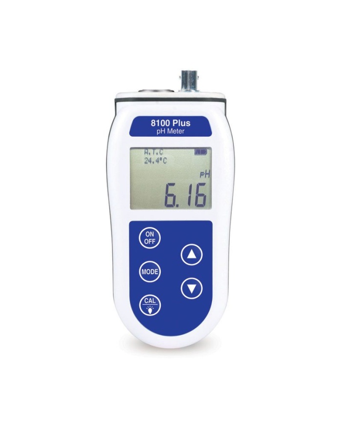 8100 Plus pH-mätare är ett tre-i-ett-instrument som har en stor lättläst LCD-skärm som indikerar pH i intervallet -2 till 16 pH med en upplösning på 0,01 pH, mV i intervallet -1000 till 1000 mV och temperatur i intervallet -39,9 till 149,9 °C med en upplösning på 0,1 °C. LCD-displayen har både indikering av låg batterinivå och en bakgrundsbelysning som kan väljas av användaren.