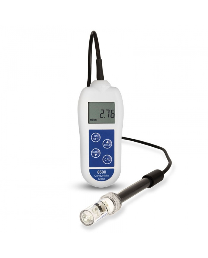 8500 konduktivitetsmätare är en tre-i-ett konduktivitetstestare med en lättläst LCD-skärm som indikerar delar per miljon över ett intervall på 0 till 3500 ppm med en upplösning på 1 ppm, millisiemens/cm över ett intervall på 0,00 till 5,00 mS/cm med en upplösning på 0,01 mS/cm och temperatur över intervallet 0 till 50 °C med en upplösning på 0,1 °C.