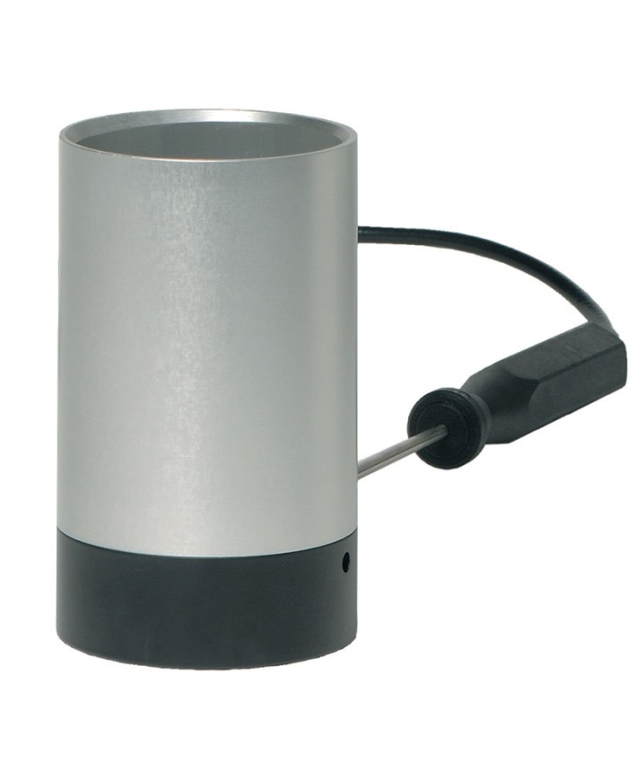 Komparatorn består av en aluminiumkopp Ø60 x 100 mm med en solid matt svart bas. Basen innehåller två Ø3,5 mm hål, ett för en referenstermometers sond och det andra för en ytterligare sond, om det behövs.