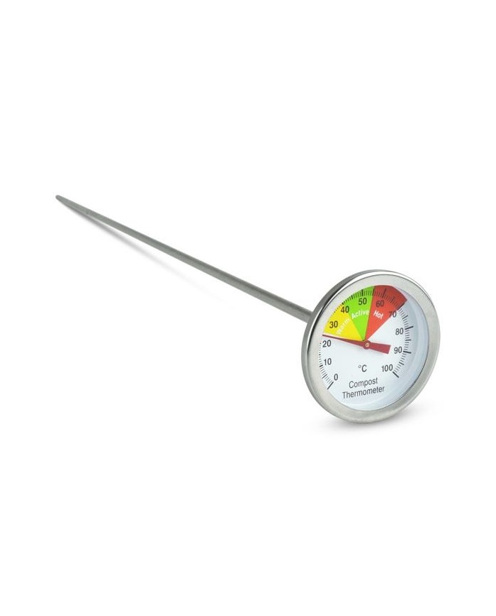 Denna komposttermometer i bimetall har en färgkodad, lättläst urtavla. En komposttermometer är en viktig del av utrustningen för alla bra trädgårdsmästare, när det gäller att fastställa temperaturen på någon komposthög.