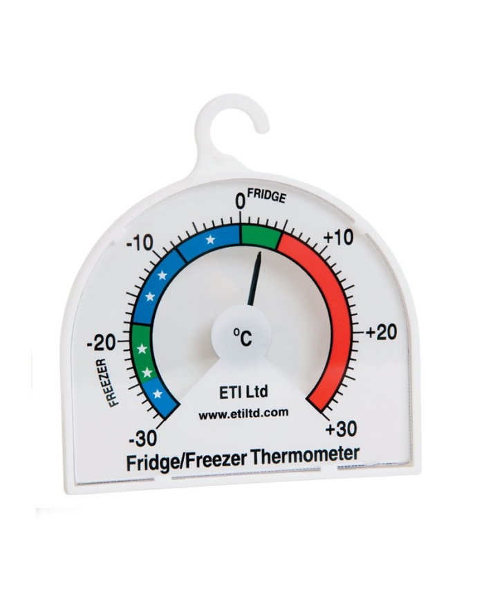 Det färgkodade området innehåller traditionella stjärnmärken i kylskåpet och indikerar när termometern har rätt temperatur för ett kylskåp eller frys. Höljet mäter 70 x 60 mm och kan stå fristående eller hängas upp från en hylla.