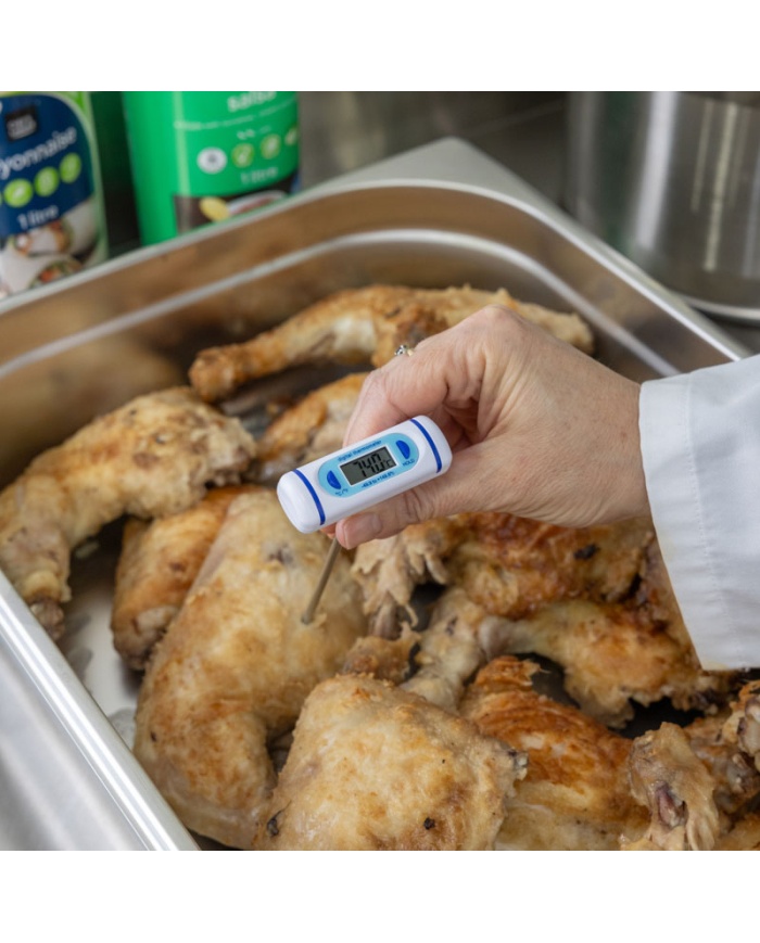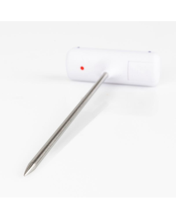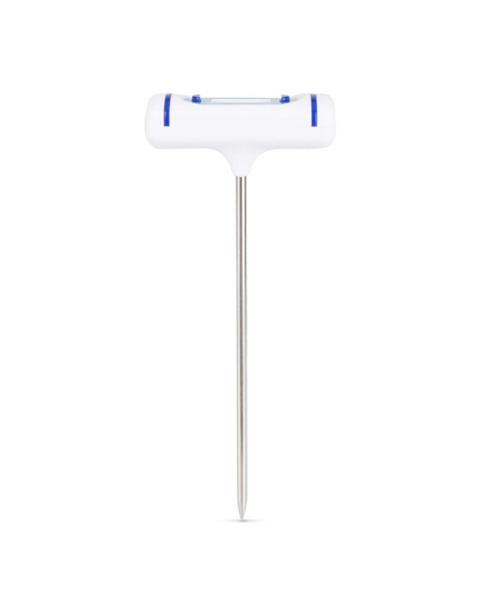 Ficktermometer, T-formad. Denna praktiska ficktermometer mäter temperaturen i intervallet -49,9 till 149,9 °C. Termometern har en Ø3,5 x 120 mm penetreringssond i rostfritt stål. Termometern har en °C/°F-omkopplare och en displayhållningsfunktion. Varje enhet levereras med ett sondskydd som innehåller en fickklämma.