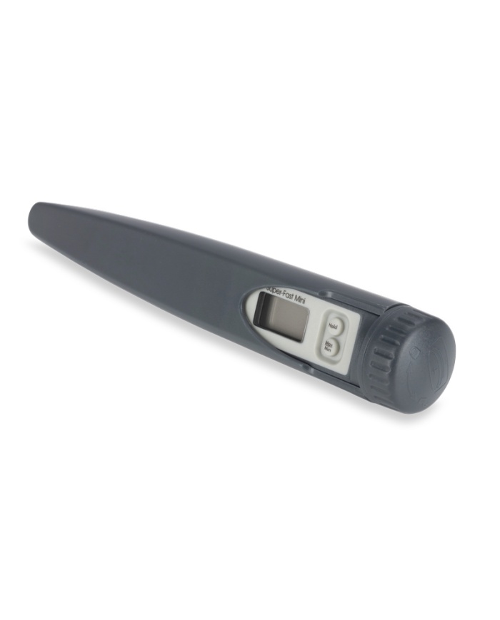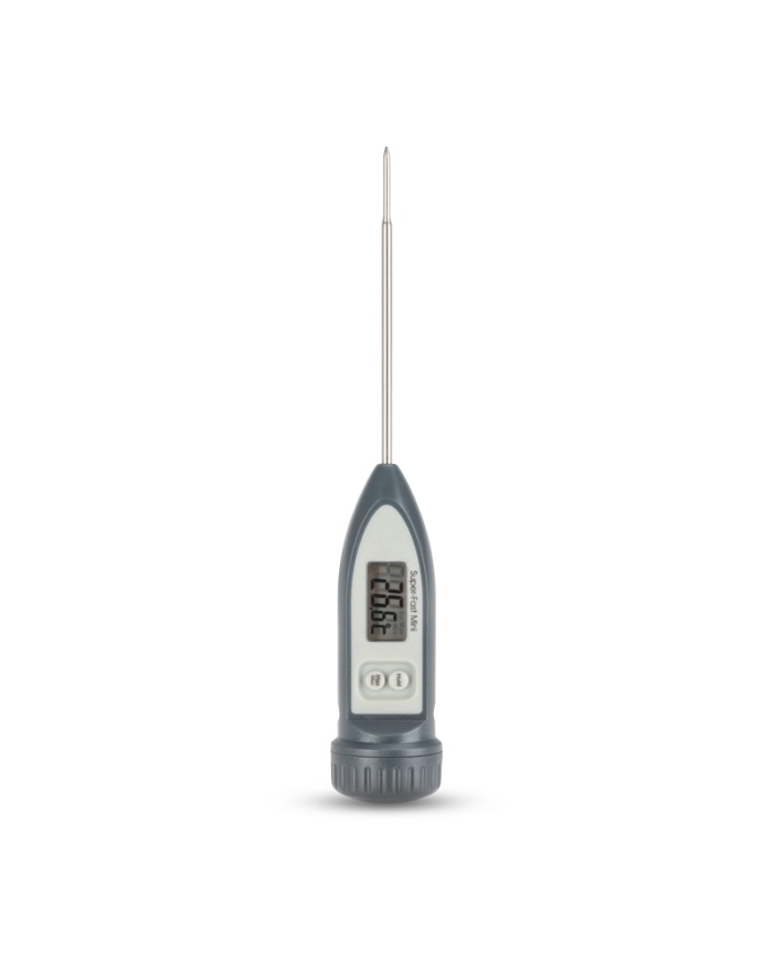 Den supersnabba minitermometern är en vattentät (IP65) termometer i fickformat som mäter temperaturen i intervallet -39,9 till 149,9 °C med en upplösning på 0,1 °C/°F, som slås på automatiskt när sondskyddet tas bort, vilket möjliggör snabba och enkla temperaturmätningar.