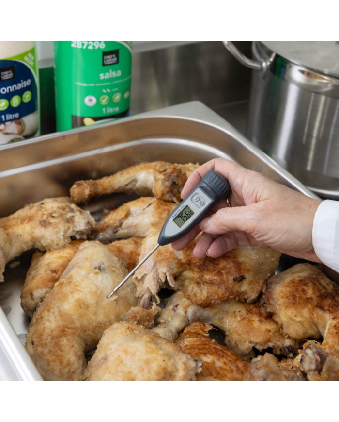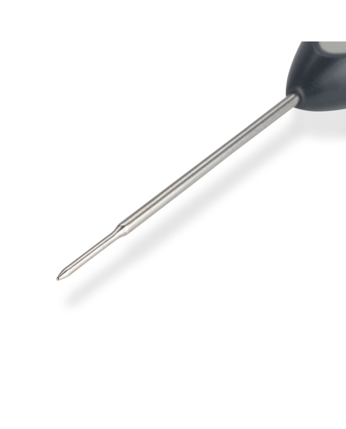 Termometern innehåller en snabb respons Ø2,5 x 73 mm rostfritt stål penetrations sond med reducerad spets och funktioner max/min och håll funktioner.