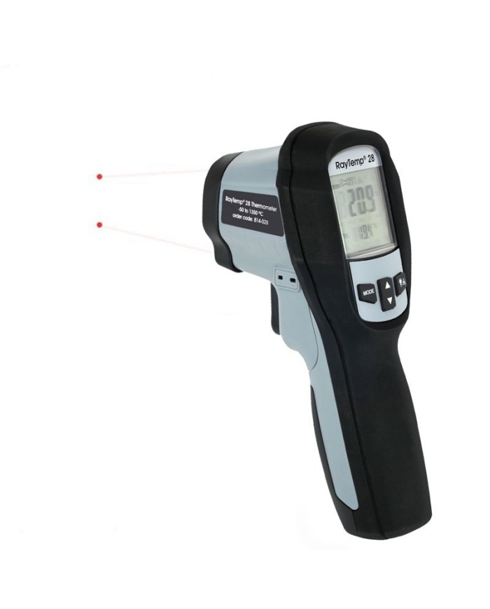 RayTemp 28 är en professionell infraröd, beröringsfri termometer med dubbel laserpunktsinriktning. Termometern innehåller ett 30:1 optiskt förhållande (målavstånd/diameterförhållande), vilket gör det möjligt för användare att mäta små mål från ett avstånd eller något föremål som är svårt att nå.