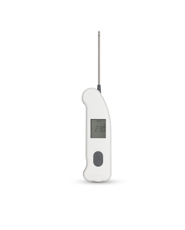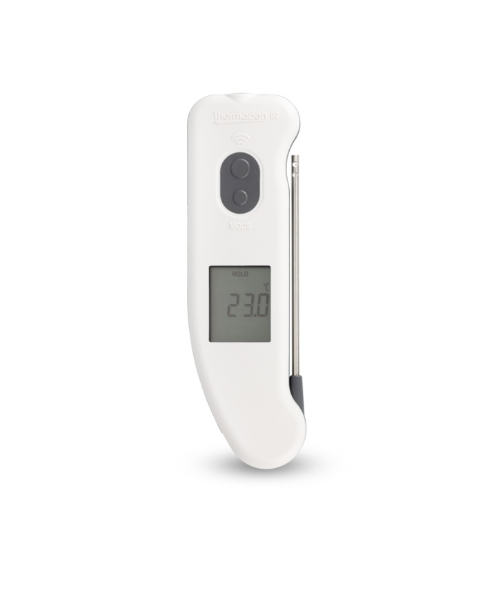 Thermapen IR lufttermometer innehåller en max/min temperaturfunktion som nås via MODE-knappen (endast IR). Avståndet till målförhållandet är 5:1, därför bör termometern placeras så nära målet som möjligt. Standardemissiviteten är 0,95 men kan vid behov justeras mellan 0,1 och 1,0 via MODE-knappen.