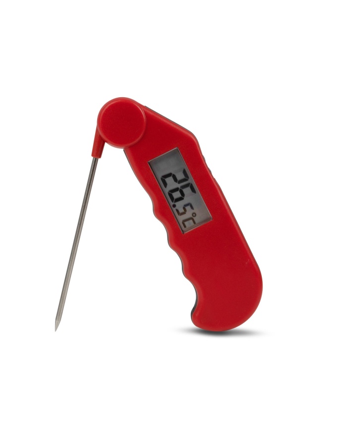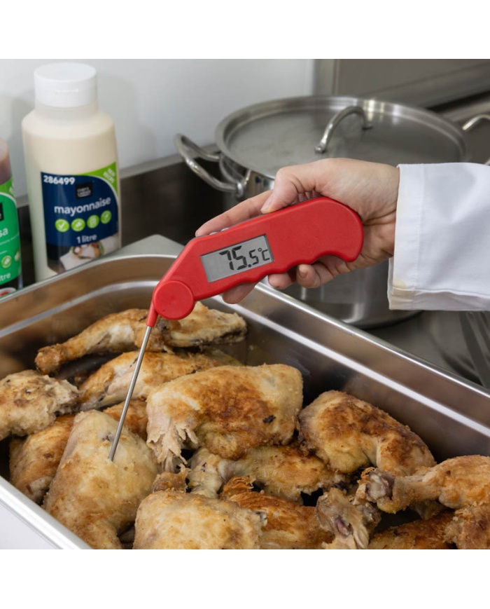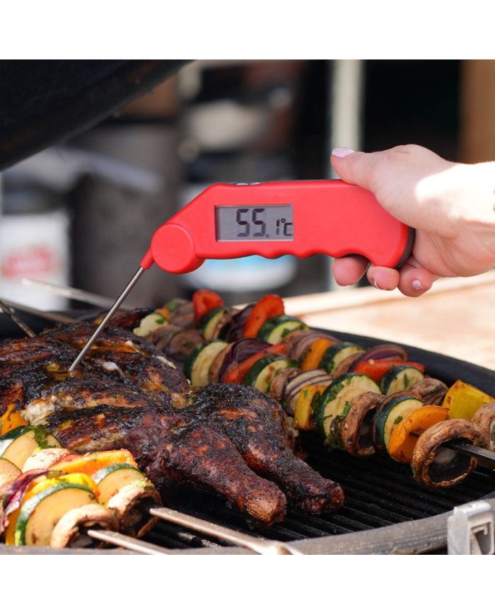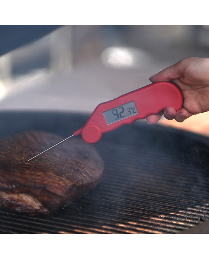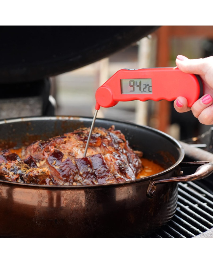 Perfekt för HACCP-efterlevnad och hälso- och säkerhetsrutiner mäter Gourmet-termometern noggrant temperaturer från -49,9 till 149,9°C med utmärkt ±0,5°C noggrannhet över större delen av sitt mätområde. Den stora, lättlästa displayen visar temperaturen med 0,1°C upplösning, och den praktiska hållfunktionen låter dig fånga avläsningar på svåråtkomliga platser. Det ergonomiska röda höljet innehåller Biomaster antibakteriellt skydd, och den vattenresistenta designen gör den lämplig för användning i fuktiga köksmiljöer samtidigt som den upprätthåller tillförlitlig prestanda. Den röda färgkodningen är idealisk för att implementera livsmedelssäkerhetssystem där olika termometrar är avsedda för specifika livsmedelstyper eller beredningsområden.