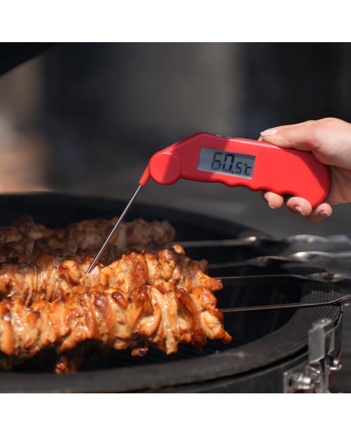 ETI 17-810734 Gourmet Termometer i rött är en professionell vattenresistent termometer med vikbar mätsond, designad för noggrann övervakning av livsmedelstemperaturer. Denna mångsidiga termometer har en livsmedelssond i rostfritt stål (Ø3,5 x 110mm) som enkelt viks in i sidan av instrumentet när den inte används, och roterar 180 grader för säker transport. Med en förlängd batteritid på upp till 5000 timmar och automatisk avstängning efter tio minuter är den idealisk för långvarig användning i upptagna kommersiella kök.