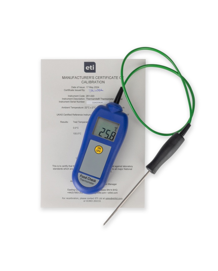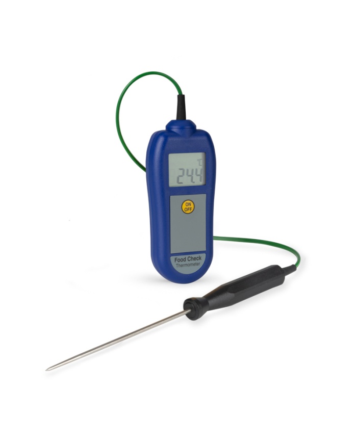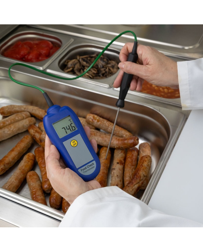Food Check handhållen termometer är en enkel och exakt enhet för att ta dagliga temperaturkontroller som en del av HACCP och andra hälso- och säkerhetsprocedurer. Med en hög noggrannhet på ±0,4 °C och ett GRATIS spårbart kalibreringscertifikat kan du vara säker på noggrannheten i dina avläsningar.