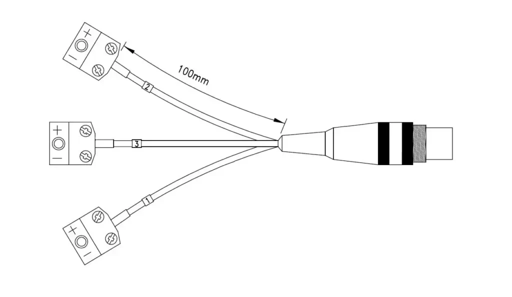 Anslut en kompatibel typ T termoelement sond till var och en av sub-min kontaktblock för att mäta upp till tre olika mätpunkter via tre kanaler. Varje kanal är markerad på kabeln för ökad bekvämlighet.