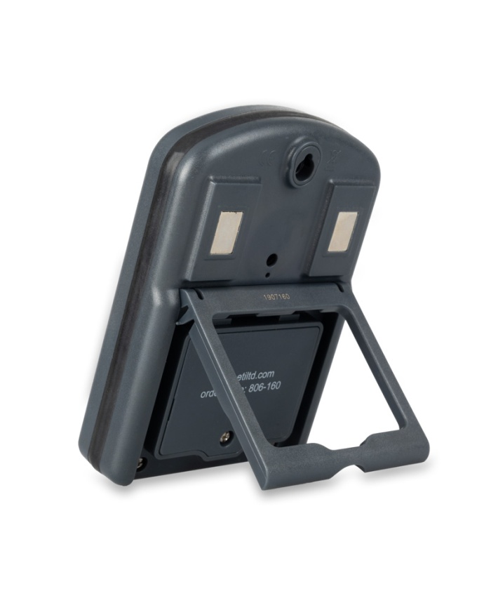 När ett nedräkningslarm ljuder startar uppräkningstimern så att du ser hur lång tid som går efter att ditt larm har ställts in. Minnet behåller din senaste nedräkningsinställning. Timern innehåller två magnetiska kuddar, ett utfällbart stativ. Timern mäter 28 x 90 x 130 mm och drivs av ett 9 volts PP3-batteri.