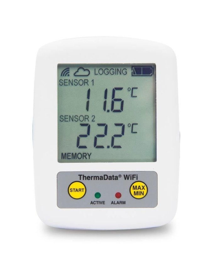 2.050 krETI ThermaData® Pharm WiFi TD2F Temperaturlogger. 2-kanalig. 2st externa termistor-givare som emulerar vaccinbehållare. Med display. Kalibreringscertifikat